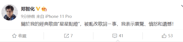 虽然修改过后的歌词听起来同样朗朗上口,而且更符合当下的时代。不过,或许是节目组修改歌词之前,没有和原创郑智化打招呼,或者是沟通不够到位。刚刚,郑智化发文回应歌词被修改一事:“关于我的经典歌曲《星星点灯》,被乱改歌词一事,我表示震惊、愤怒和遗憾”,看得出他十分生气。