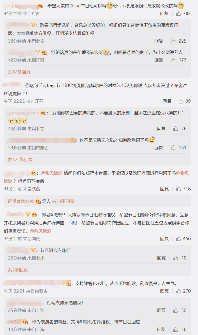 评论区中,有些网友责备5位姐姐,不过,也有网友为姐姐们鸣不平:“希望大家有事cue节目组可以吗?歌词不是姐姐们想改就能改的啊”,还有网友直接帮助圈出《乘风破浪》官方账号:“郑老师您好!支持您向节目组进行维权,希望节目组能够好好审核词意、立意并和原创老师沟通后再进行选曲,同时,希望节目组尽快作出回应,不要试图让五位表演姐姐替你们承担责任。”