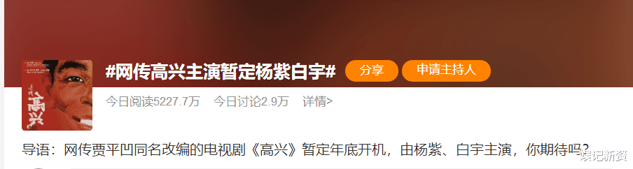 这边综艺还在录制之中,那边又有新剧的消息传来,这次是什么瓜,我们一起浅磕一下。网上有消息传出,由贾平凹同名小说改编的电视剧《高兴》暂定年底开机,女主角是杨紫、而男主角方面则是白宇。