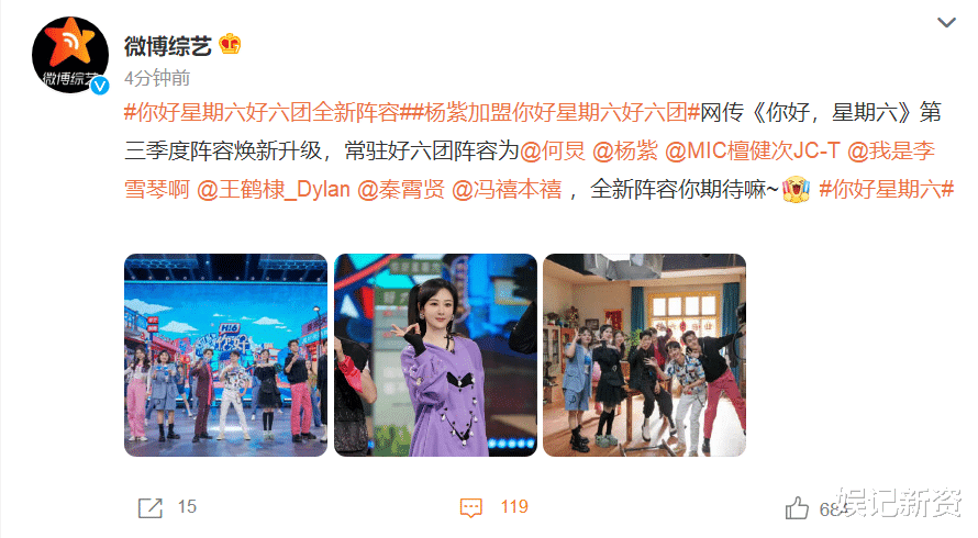 而最关键的是那句“好6团”的全新成员杨紫,大家都知道““好6团”是《你好,星期六》的常驻嘉宾团,这样说的话杨紫要常驻《你好,星期六》的意思吗?如果真的是这样的话那还真的算是一个好消息,以后可以经常看到杨紫的新综艺了。