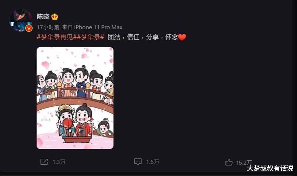 男主角陈晓在《梦华录》剧中深情、专一,加上擅长眼神戏的他,散发甜而不腻的氛围,不只让陈晓人气急升,还重振他古装美男的形象,而陈晓昨则晒出全员超萌Q版画作告别,并以“团结,信任,分享,怀念”八字做总结。