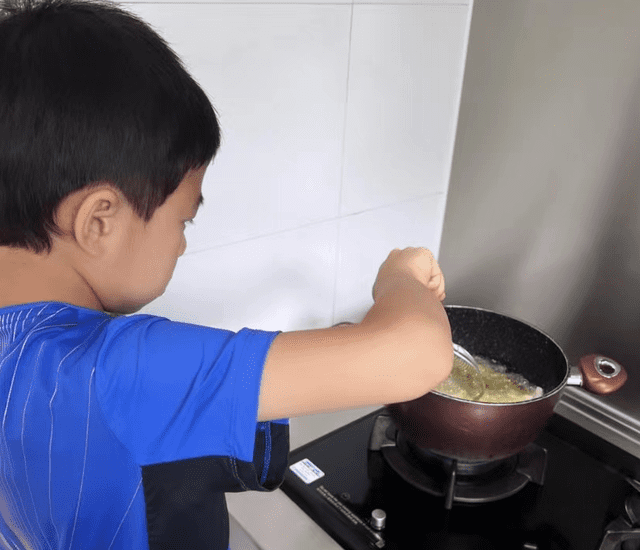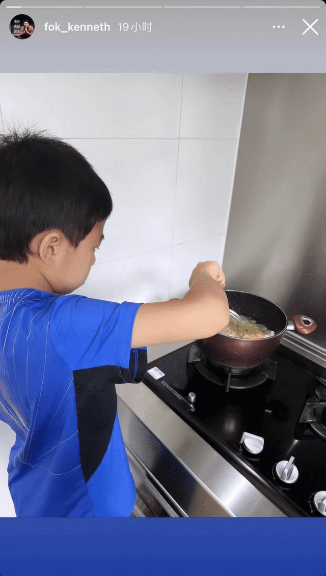 画面中,霍启刚的儿子霍中曦全程掌勺,专心致志地炸着薯条,表情很是认真。8岁的霍中曦婴儿肥还未完全褪去,侧脸圆润,看上去十分可爱。