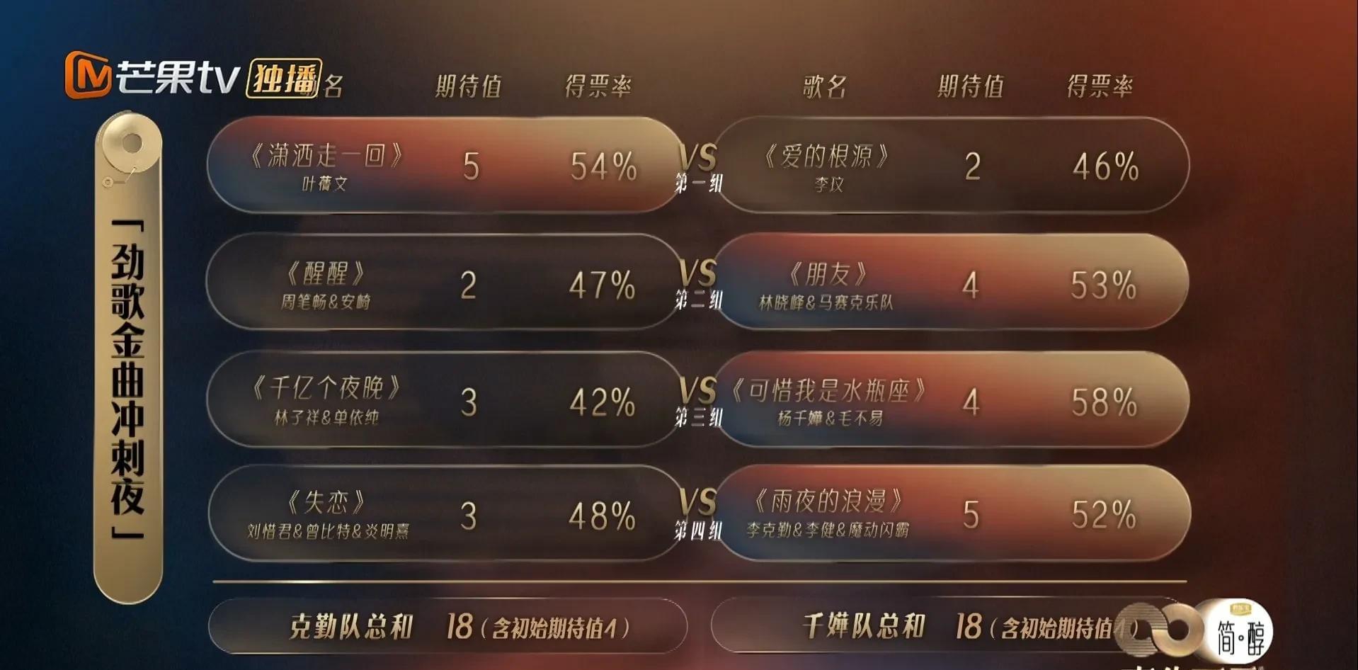 四个回合对决结束后,两队的总期待值都是18,战平!这样最终的结果就是两队全员出战(金曲盛典),这算是一个皆大欢喜的结局,只是给人雷声大雨点小的感觉,就像毛不易说得“很假”,但是那又能怎样呢?只是一场游戏而已,也不必当真,大家开心就好!