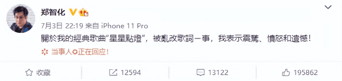 事件在网络上不断发酵之后,原唱郑智化很快就看到了,并在社交平台上发文,用三个词语来表达自己的不满,分别是“震惊、愤怒、遗憾”!