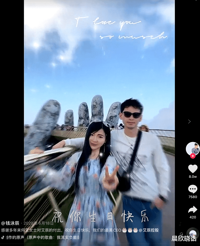 2020年,钱泳辰在PO出的为何艾庆生的照片中,每一张都写上了深情款款的“I love so much”。