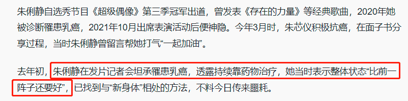 在2021年初的某次活动中,朱俐静透露自己目前还在靠药物治疗,并且整个人的状态都有所好转,她已经学会了与癌症“共存”了。