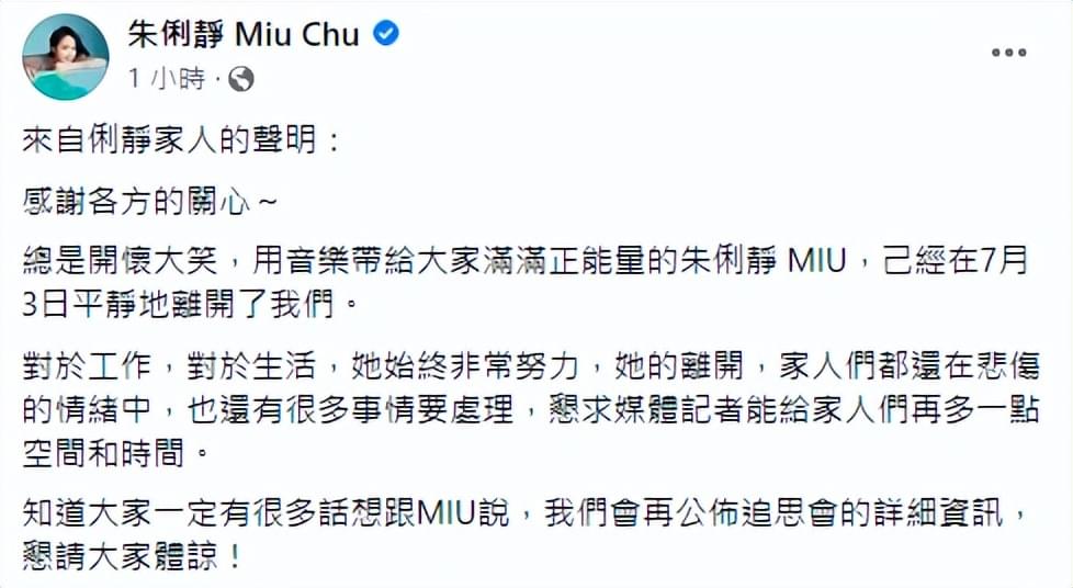 据了解,朱俐静于7月3日平静地离去,她的家人们目前还沉浸在悲痛中,之后会再次公布追悼会的详细细节,希望媒体和记者能够给他们一些时间。