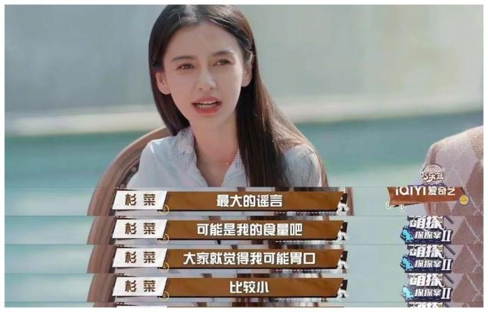 这是2015年播出的《云中歌》中的这一场吃饭戏,嘴巴没有碰到实物,但她却做得很好吃,网友们纷纷表示:“很明显是假的。她在吃空气吗?”这件事让Angelababy被吐槽了很久,但她一直没有回应。直到最近,baby在最新一期的综艺节目《萌探2》中,次回应“假吃”这个谣言,也上了热搜,网友们纷纷议论。Angelababy说大家对她最大的误解就是觉得她胃口比较小。