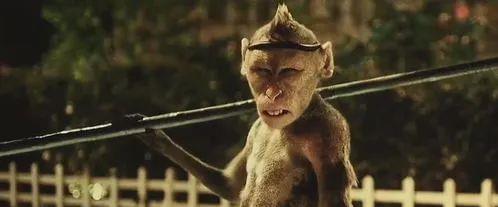 从中国的“千年猴戏史”来看,无论在民间还是在庙堂,大多数时段,传统猴戏大体上是受人喜爱和欣赏的,然而,当传统猴戏在科幻电影中遭遇“外星人”时,猴子形象和猴戏格调都被翻转。可爱的猴子心性聪明,人类训练它们,让其做灵巧机敏的表演,往往产生意想不到的娱乐效果,但这种主流的猴戏形态在中国科幻电影的“外星猴戏”中遭遇挫折。《疯狂的外星人》中开场猴戏颇为欢乐,黄渤饰演的耿浩,作为耍猴人,跟猴子“欢欢”搭配默契,只可惜,台下观众并不买账,他们对手机里的高科技娱乐更感兴趣。当外星猴子闯入传统猴戏场时,某种怪诞的想象力便弥漫开来。外星猴子不再是传统中国江湖中灵巧可爱的爱翻筋斗、竖蜻蜓的形象,而是一副怪诞造型。耿浩抓住这只外星猴子后,颇为自信却又充满疑惑地猜测它是一种罕见的猴,沈腾饰演的大飞则将其调侃为“刚果骚骚猴”。《疯狂的外星人》中对于外星猴子的想象,虽然仍以传统的猴子造型作为基础,但其瘦削干瘪的面容和身躯已与可爱形象相去甚远,而更近于怪诞。所谓“刚果骚骚猴”的称谓,则掺杂了对于非洲动物特征的想象。传统猴戏在电影里一出场,就被作为“闯入者”的外星猴子打破,其怪诞想象牵引着其后“外星猴戏”的走向。耿浩、大飞与外星猴子组成的“三人行”引发了诸多“耍猴与被猴耍”的热闹与欢腾事件,然而,其间传达的是地球人与外星人的对抗与斗争。套用大飞的话就是,“犯我地球者,虽远必诛”。