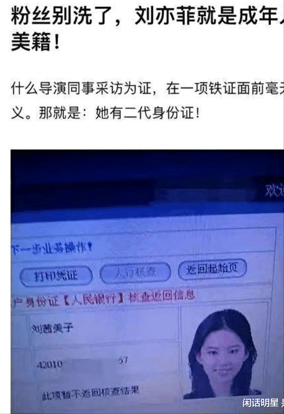 国内的第二代身份证,是2003年开始使用的,原来的一代身份证号码是15位,二代身份证的号码是18位。如果刘亦菲有国内二代身份证,也可以说正常,那个时候,她是北京电影学院表演系的大学生。刘亦菲是在2002年回国,并考上的北京电影学院。那个时候,有关部门对于身份证的管理,包括国籍的管理,并不是很严格。不少人(有权有势有权者)拥有几个户口、几个身份证、几本护照。不少已经加入外国国籍的人,也有中国大陆的户籍和身份证。刘亦菲的情况是不是这样,我们不得而知。而网友的爆料,也没有得到证实。