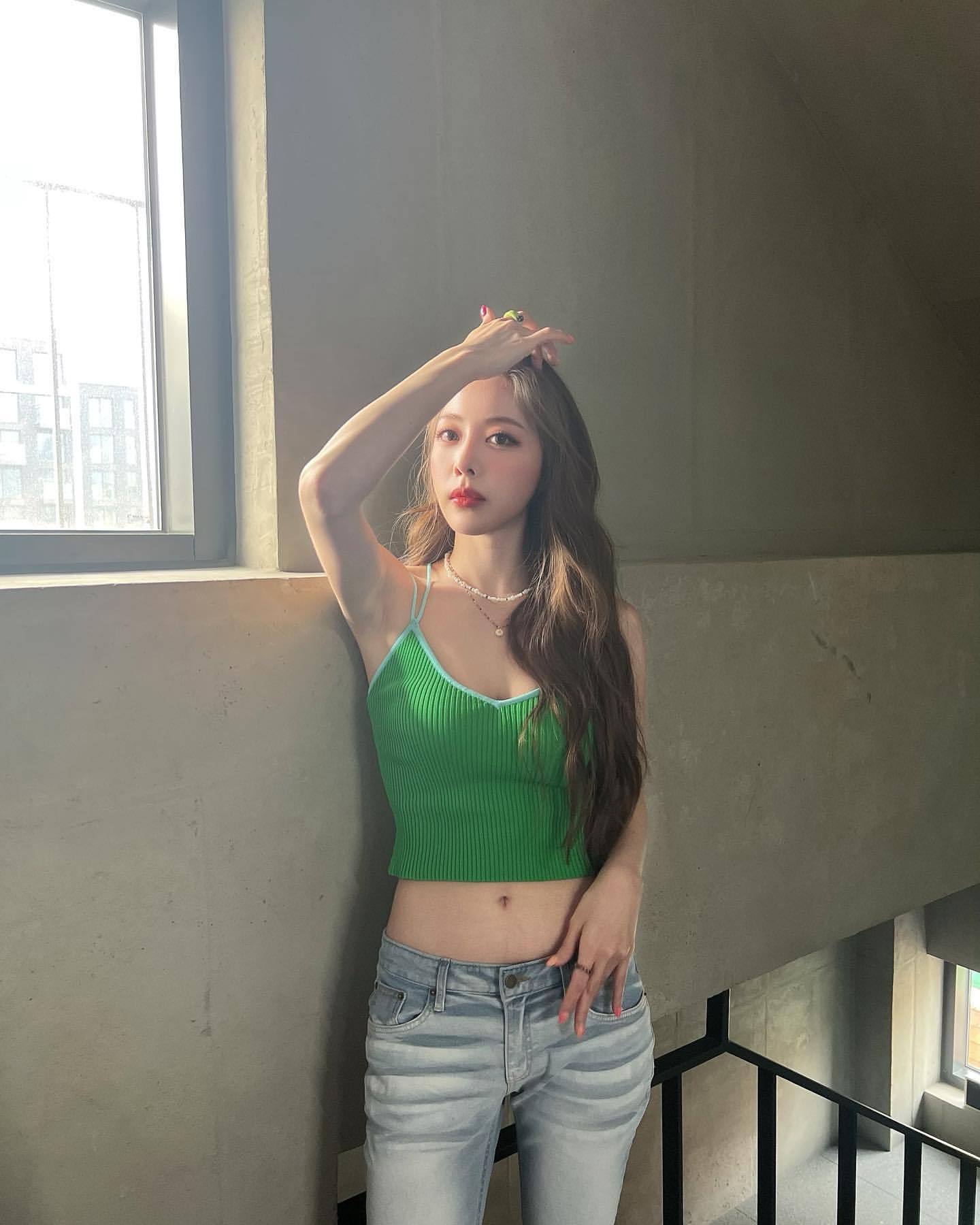 在公开的照片中,BraveGirls洪恩智用牛仔裤搭配绿色露脐T恤上衣展示了她的性感造型,有着洋娃娃般的美貌的洪恩智,以纤细的腰线和丰满的身材展现了自己完美的身体线条,散发出致命的魅力,令人赞叹。