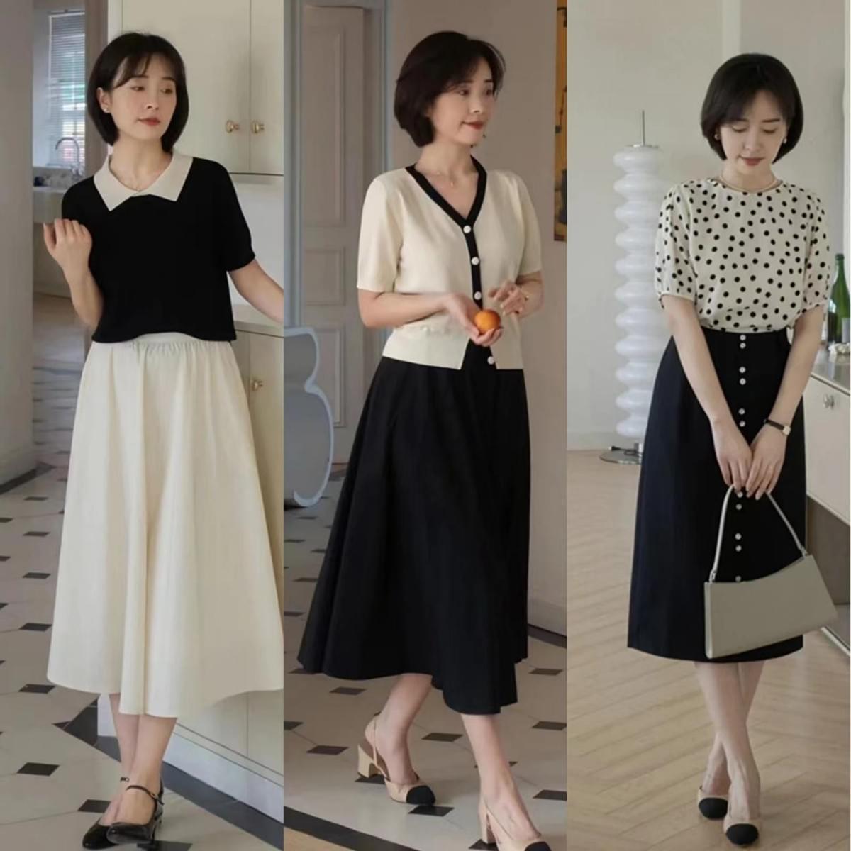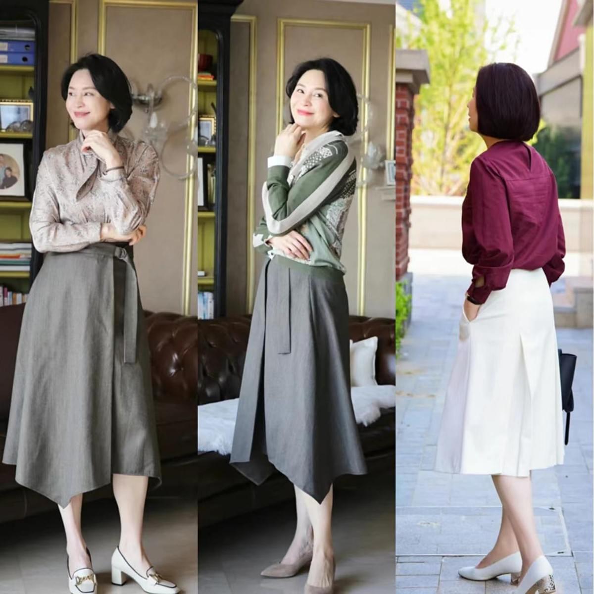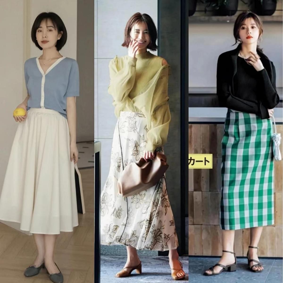 半身长裙款式不宜花哨,以黑白灰、卡其色、淡彩色系为主的纯色款,或者波点裙、格纹裙更简约得体。