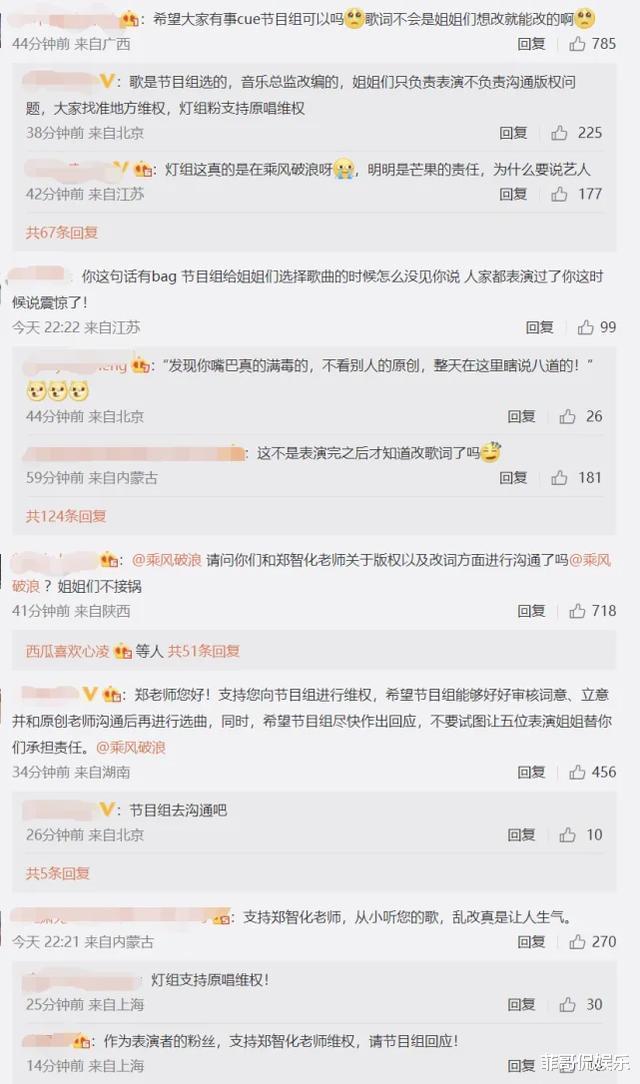 不仅如此,原曲的风格也从充满年代的沧桑,被改编为说唱甜美女团风,节目组此番行径引发原创不满,《星星点灯》的作者郑智化更是深夜发文怒斥称,对此感到震惊、愤怒与遗憾。随着郑智化发文怒斥节目组之后,评论区也出现了两极分化的局面,部分网友称此番改编对原唱极其不尊重,纷纷力挺郑智化维权。除了支持的声音外,也有人为王心凌组抱不平,表示改编是节目组的行为,和王心凌等人无关。