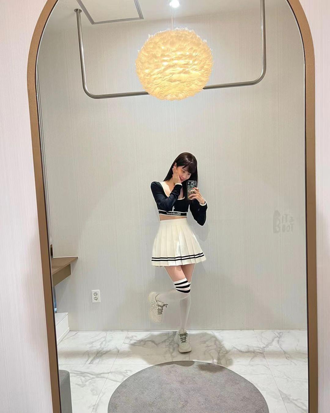 在公开的照片中,徐贤身穿让人联想到少女时代舞台装的啦啦队造型服装,黑色的短款运动上衣,配上短裙和运动袜。在镜子前拿着手机自拍的徐贤,以可爱的姿势和娃娃般的身材比例,展示了她作为女团爱豆在少女时代活动中的美,她的五官也散发着“少女时代里最小的孩子”的气息。