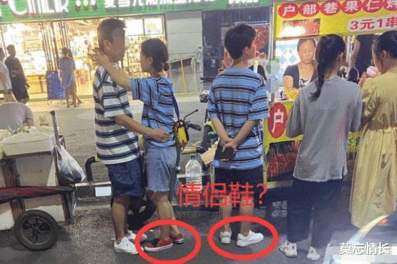 妹子的男朋友如果是左边穿黑白条纹的哥们,那么她为何与别的男生穿情侣装?或许这可以用撞衫来解释,但脚上的情侣鞋又是怎么回事?总不可能撞了衫之后又撞鞋子吧。这混乱的男女关系,真令人摸不着头脑。