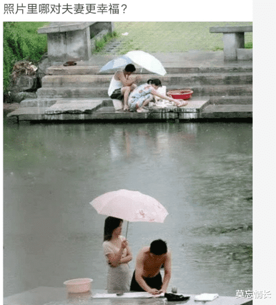 同样都是在雨天洗衣服,上面那对夫妻是妻子洗衣服,丈夫则撑着两把雨伞,而下面那对夫妻的情况正相反,你觉得哪对夫妻的生活更幸福呢?其实每个人的生活都不一样,对于幸福的定义也各不相同,有时候可能你觉得幸福,但人家未必也这样想。