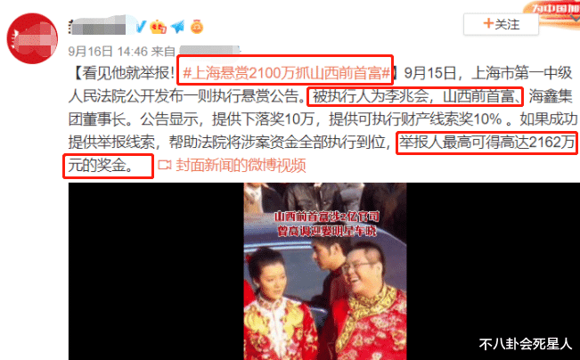 离婚后,李兆遭遇了金融危机,直接从首富变成了老赖。去年,上海还发布了悬赏2162万抓李兆会的消息,不过他至今都没有被找到。