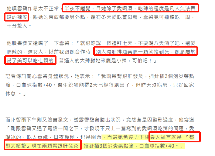 此次肾脏和肝部发炎,疑似也和雪碧平时的不健康生活习惯相关,但更为重要的原因,似乎是因为雪碧近些年来整容过多而导致。