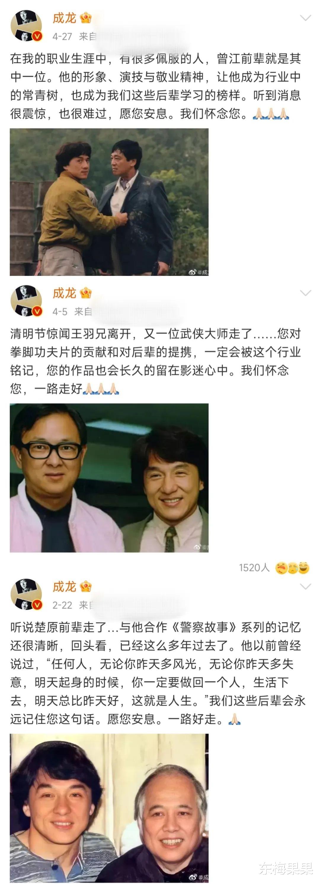 这时候你再去翻成龙的微博,才发现2022年到现在也才刚过半,但他已经陆续送走了演员曾江、武侠大师王羽和导演楚原,再加上昨天的两位。