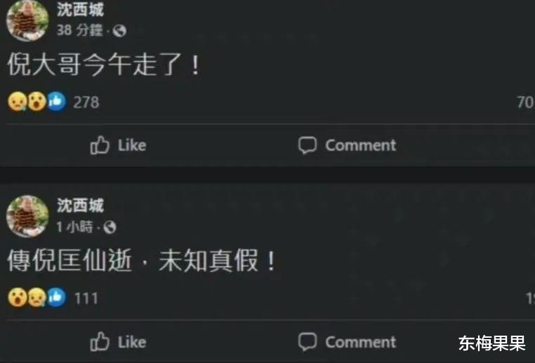 开始是作家沈西城在脸书上发文,说“倪匡仙逝,未知真假。”过了半小时后再发文,才确认倪匡确实于昨日下午三点,在家中去世。