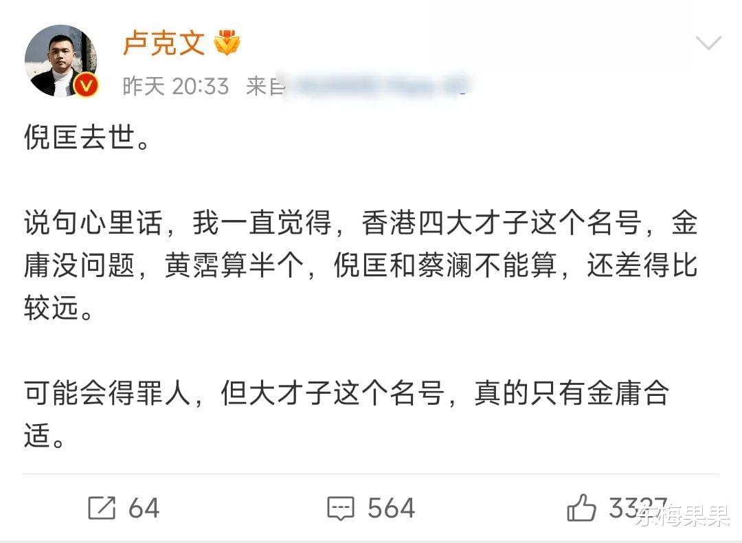 到昨天倪匡也去世,这时候能送他的四大才子里只剩下蔡澜了。