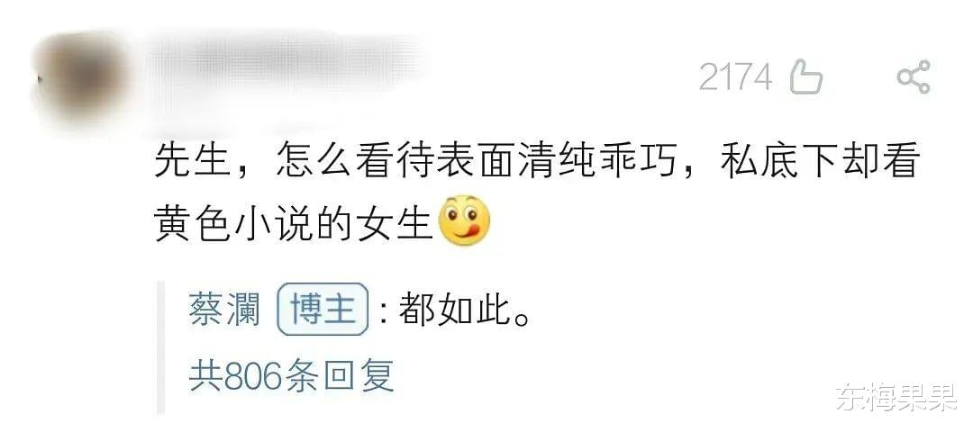 问:“怎么看待表面清纯,私底下却看黄色小说的女生。”蔡澜:“都如此。”