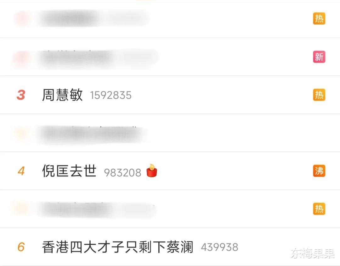 同时上热搜的还有周慧敏,甚至热搜位一度比倪匡去世的词条还高。