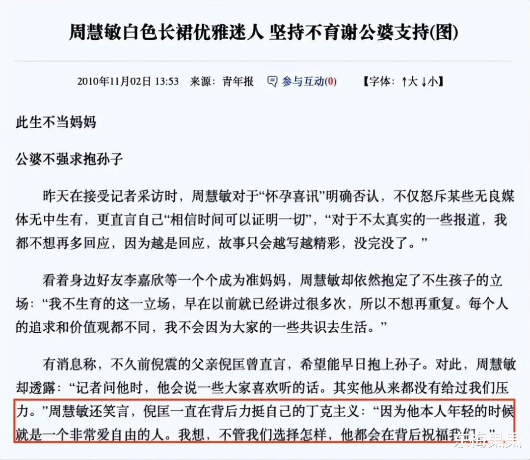 周慧敏透露过,倪匡之所以会这么说,只是因为大家喜欢这么听。其实倪匡在背后一直力挺自己丁克,而且不管她和倪震如何,倪匡都会祝福她。