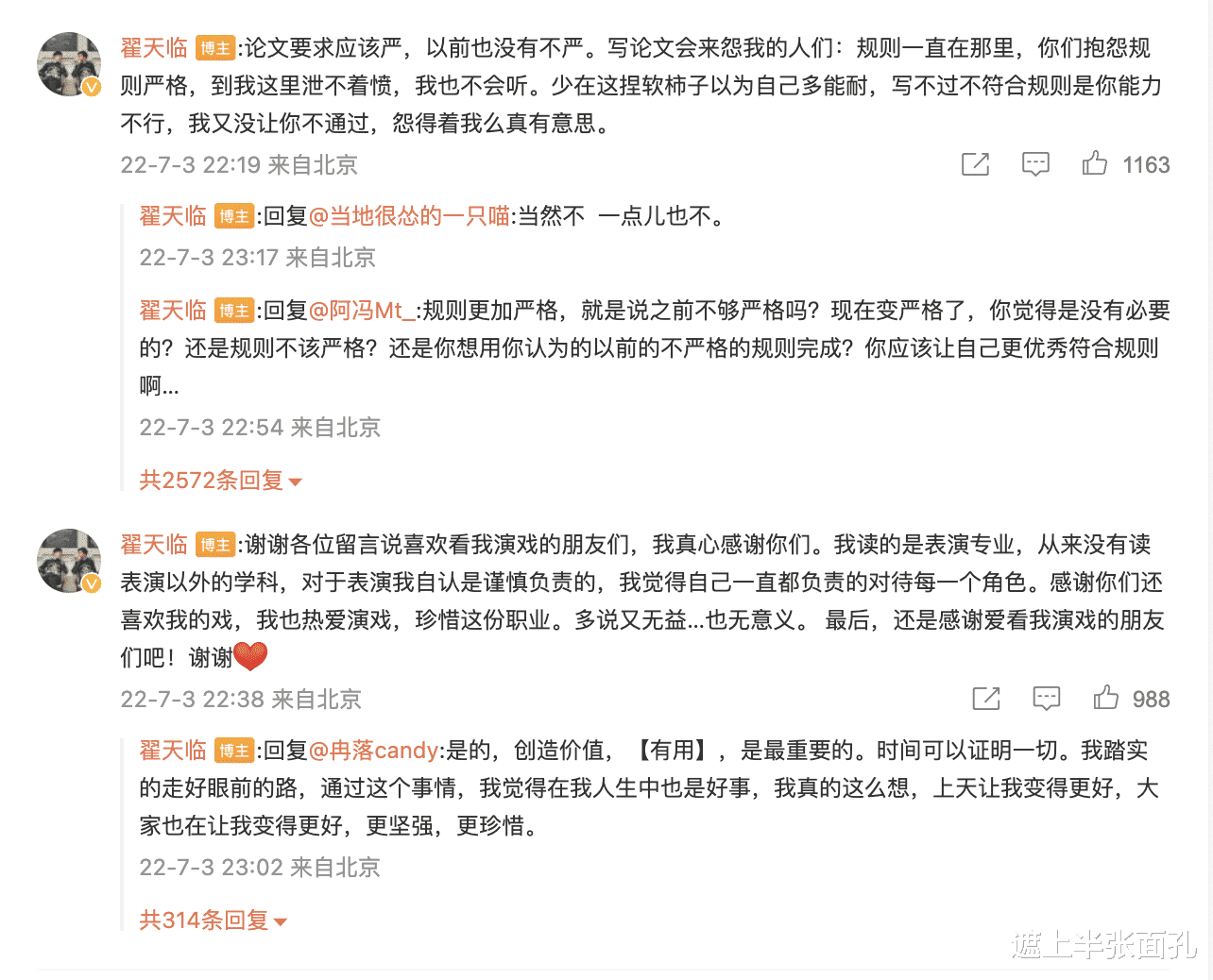 此外,翟天临疑似并没有完全承认自己“学术造假”的事实,他认为写论文并不一定要用知网,他读的是表演专业,从来没有读表演以外的学科,他自认为对表演的态度是谨慎负责的,没有对不起任何人,时间可以证明一切。