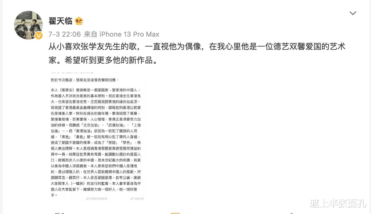 7月3日,张学友发布声明回应网络上的争议,随后翟天临发文力挺张学友。