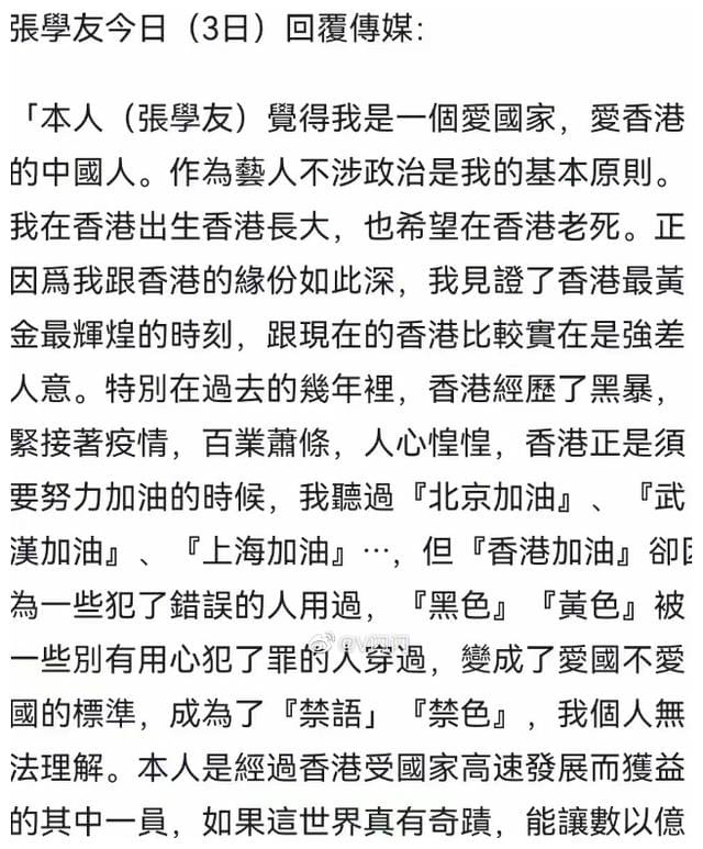 张学友说作为艺人不涉政治是我的基本原则。这句话在逻辑上多多少少有点小问题。作为一个爱国艺人,可以不涉政治,但一定要有自己的政治立场。因为你的事业发展正是得益于政治开明的大好时代,正是祖国的强大给了你事业发达的好机遇,当然对祖国要有感恩之心。试想一下,在港独肆虐之际,所有的香港艺人发表声明谴责港独分子,一定会产生非常强大的正面效应。