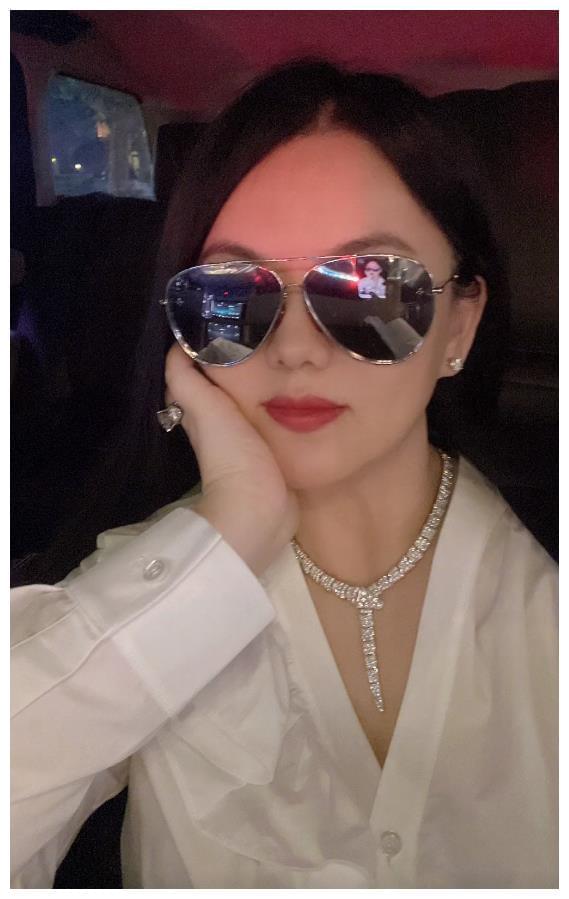 李湘的颈间则是一条价值100万的满钻项链,一整套钻石首饰价值超过百万,彰显着贵气和精致,她托着脸蛋对镜甜笑,看起来幸福且开心。