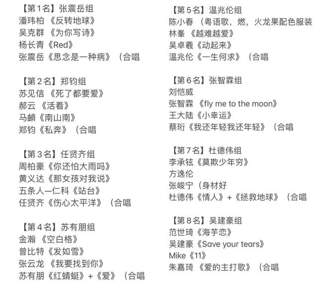 从目前网友曝光的初舞台歌单来看,信(苏见信)演唱了《死了都要爱》,马頔演唱了《南山南》,任贤齐演唱了《伤心太平洋》,苏有朋演唱《红蜻蜓》和《爱》,潘玮柏演唱《反转地球》,吴克群演唱《为你写诗》。