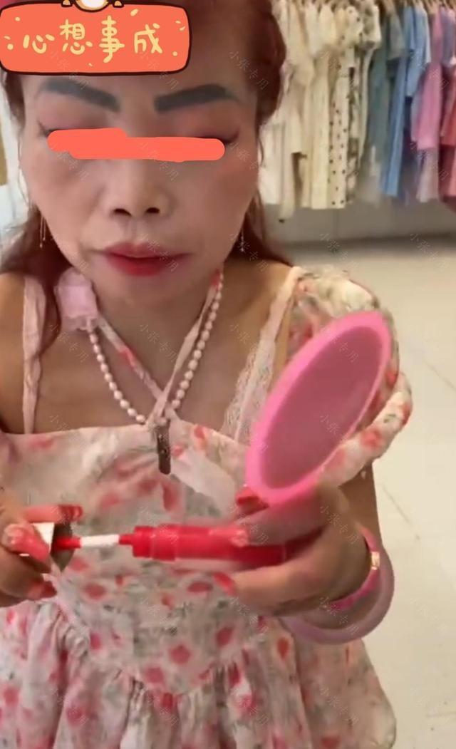 女子跟导购推销自己的唇膏,说唇膏是在两元店买的,既便宜颜色又好看,只不过容易掉色,女子补完妆后,眉毛和红唇显得整个妆容更加夸张,不过她自己似乎很满意。