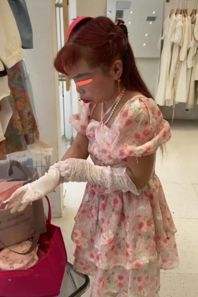 这名浓妆艳抹的女子看上去至少50岁,穿上恨天高也就1米5,她挎着玫红色皮包,身上珍珠项链等首饰倒是不少,打扮非常招摇。导购看到女子这幅打扮,实在没忍住询问女子是做什么工作的。