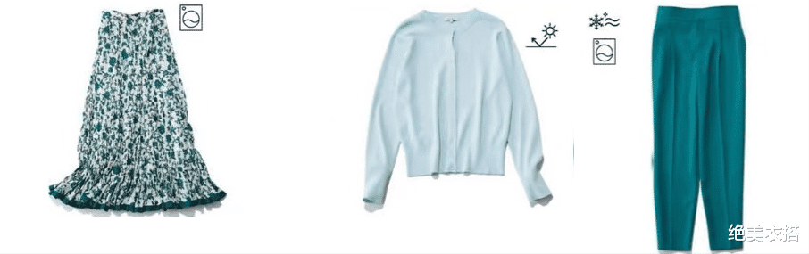 比如,蓝绿色半身裙,浅蓝色开衫,蓝绿色九分裤。