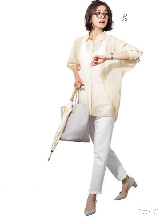 米黄色透视衬衫,因宽松版型而略显休闲,原本可以写尽优雅与性感的。搭配白色背心与小白裤,比较普通,不太适合讲究女人。