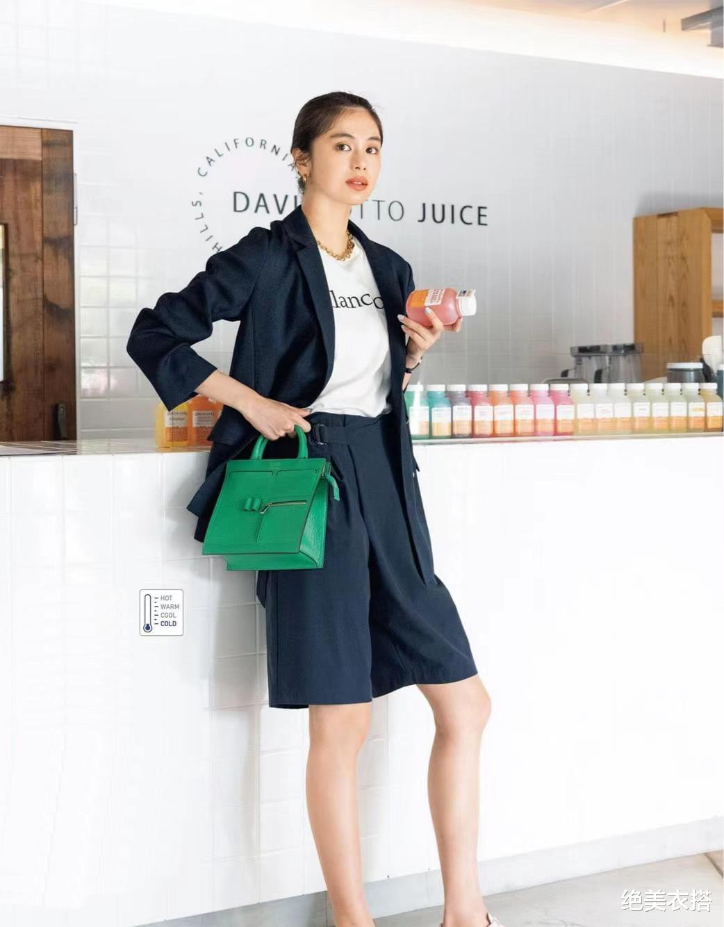 搭配黑色西装,内里白T恤衔接,竟和谐得无可挑剔。当然,绿色包包点缀,拯救了整体焦点。