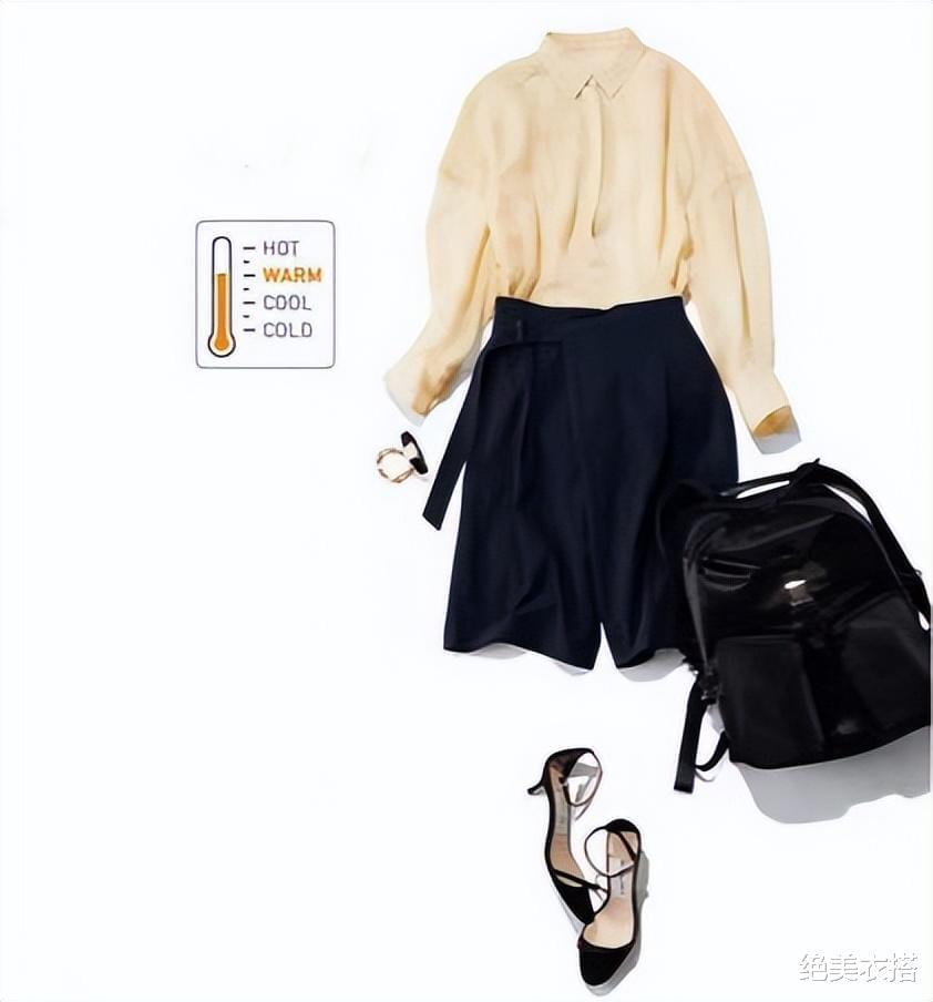 米黄色衬衫的优势,在搭配黑色中裤后愈发鲜明。比常见的黑白配明显淡雅柔和许多,也更有质感。