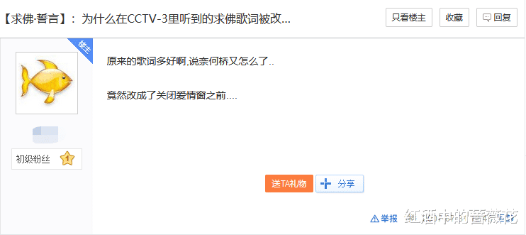 但我清晰地记得,以前在看相关晚会的时候,歌手誓言把这一句唱成了“当我在关闭爱情窗之前”。这些微的改动看似没什么,但却把原作中的佛性给大打折扣,让人怎么听都觉得别扭。