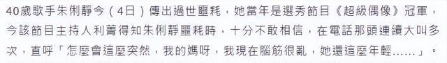 节目主持人利菁得知朱俐静去世噩耗,十分难过也很愕然,完全不敢相信。