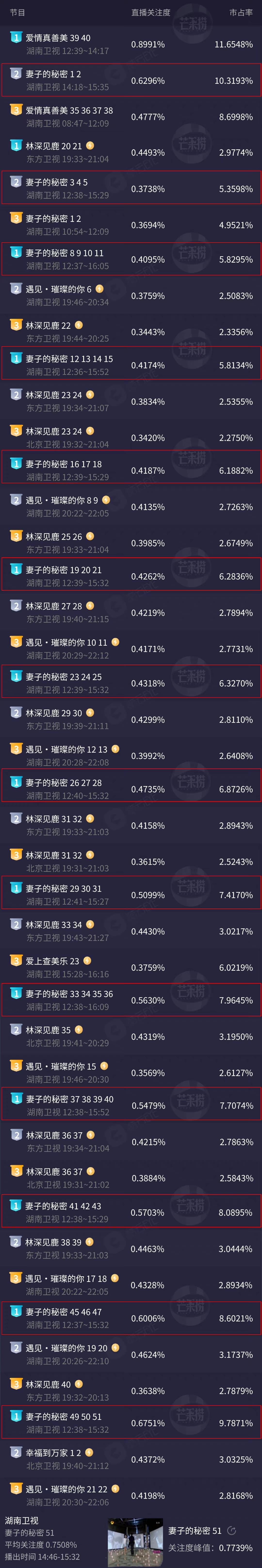 湖南卫视蹭热度太厉害了:知道《幸福到万家》马上要播了,知道刘恺威正在参加《披荆斩棘的哥哥2》,所以就播了《妻子的秘密》。所以,《妻子的秘密》收视率很高,虽然是白天,但是比很多电视台在晚上黄金时间段播出的电视剧收视率还高。