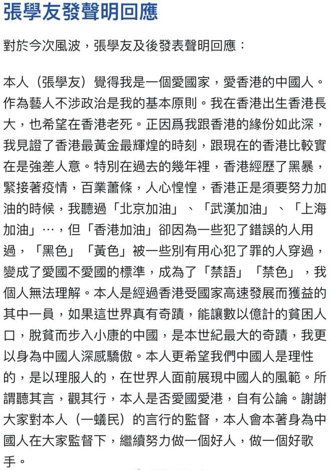 “本人觉得我是一个爱国家、爱香港的中国人。我听过北京加油、上海加油、但香港加油却因为一些犯了错误的人用过,变成了爱国不爱国的标杆,成为了禁语,我个人无法理解。本人身为中国人,会继续努力在大家的监督下做一个好人,一个好歌手。”