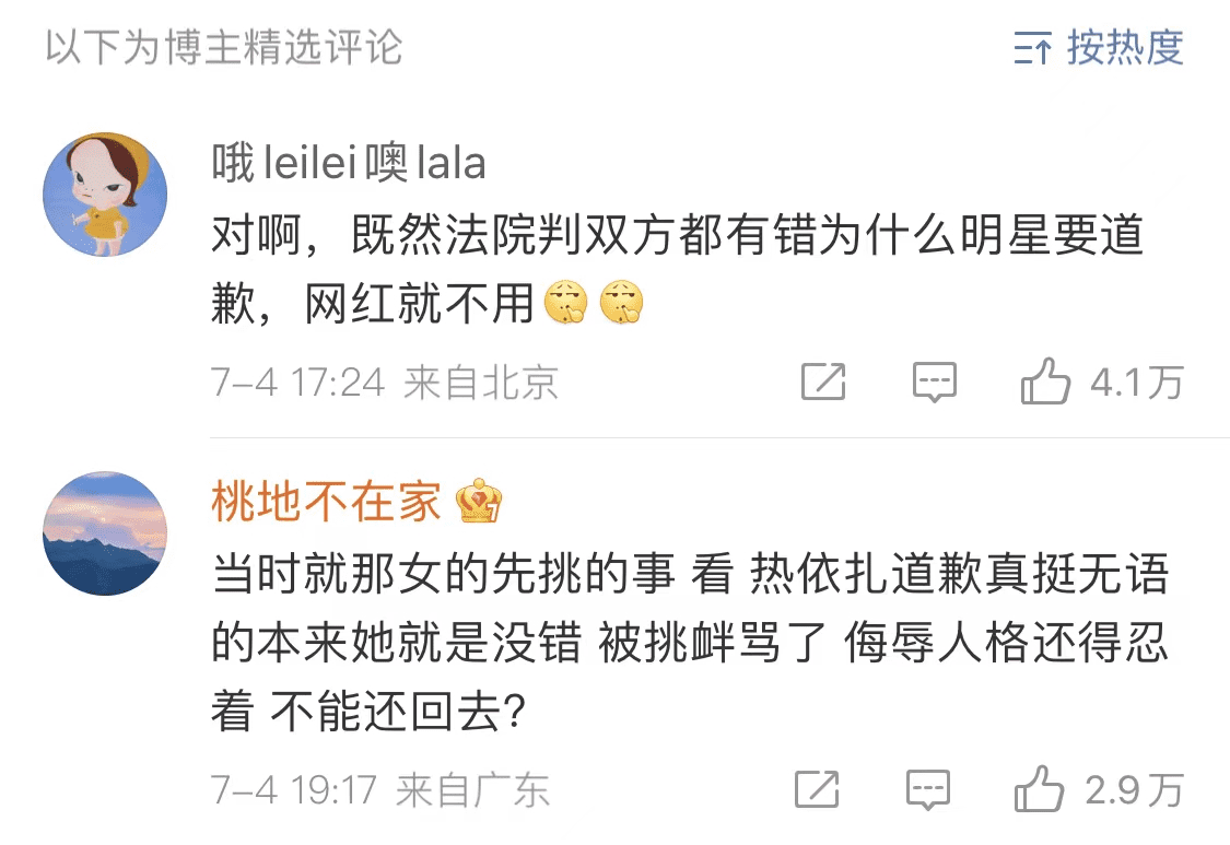 近日,北京互联网法院公开审理明星热依扎与微博号“硬核豌豆”的张某网络侵权纠纷案。内容指出,张某以“露胸癖”以及“自己找骂博眼球”等言语,来对女星热依扎进行人身攻击,二审结果出炉,两人都得互相赔偿精神损害抚慰金,切得在微博刊登道歉声明,引发许多网友的热议。