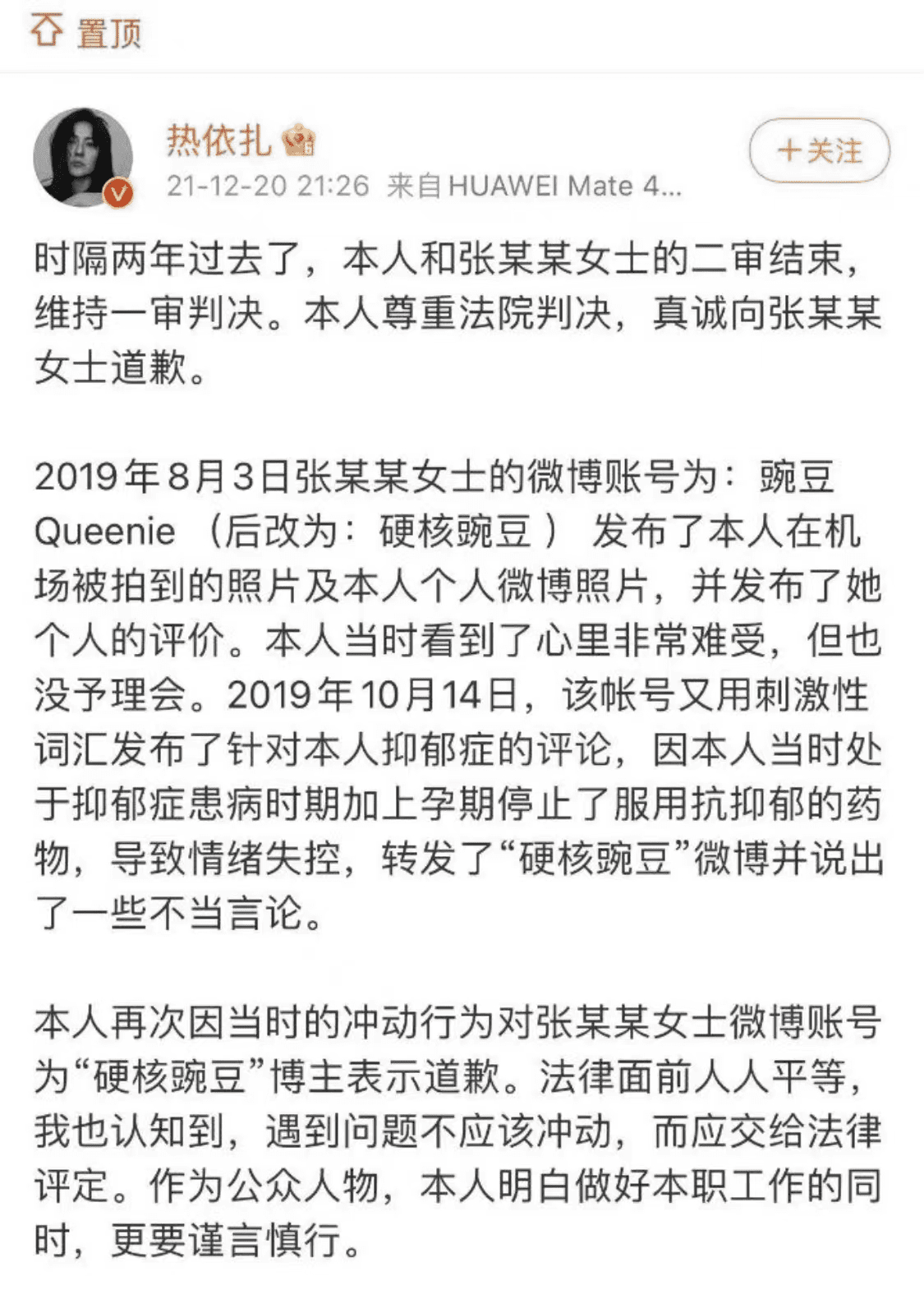随后,女星热依扎也服从判决,在2021年12月20日发文,表示自己因为患有严重的抑郁症,导致情绪失控,转发了“硬核豌豆”张某微博并说出了一些不当言论。本人也再次因当时的冲动给张某某女士道歉。随后,女星热依扎工作室也公开了法院判决书,指法院判决双方都有错,必须互相道歉,而女星热依扎这边的道歉也获得法院方面认可才发布,而她的道歉文当时还登上微博文娱榜热搜。