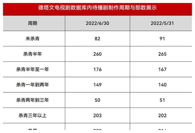 【TOP1-10】沉香如屑、玉骨遥、星汉灿烂、安乐传、纵有疾风起、长月烬明、大考、欢乐颂3、县委大院、野蛮生长【TOP11-20】少年派2、苍兰诀、昆仑神宫、重紫、公诉精英、冰雨火、隐娘、潜伏者、乐游原、与凤行【TOP21-30】南风知我意、三体、梦中的那片海、重中之重、星落凝成糖、人生若如初见、薄冰、千秋令、天才基本法、请君待播剧市场·六月解读01本月市场规模2022年6月中,共有记录在案的新开机(长)剧27部,新杀青剧25部;开机数量较上月增长3部,杀青数量较上月增长5部。开机与杀青数量已经连续两月增长,近期市场较为活跃,但囤积数量也开始增多。截止6月底,德塔文记录在案的待播剧中,按照制作周期的统计和与上月比较结果发现:目前,市场待播剧的主要增量在杀青半年到一年、杀青一年到二年的范围内,两个阶段的待播剧都较上月增加9部。待播总量亦有所上升。
