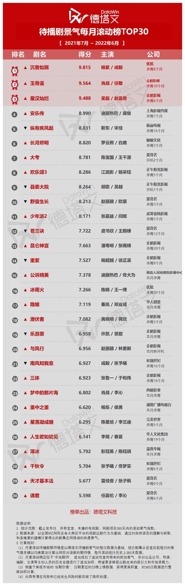 在待播景气排名TOP200的剧目中,近期关注度上升的还有《无与伦比的美丽》《灼灼风流》和《欢颜》等。06近期值得关注的市场变化六月下旬,电视剧制作协会发布了关于创建“南海平台”的通知,称将采用区块链分账模式,向海内外市场分发电视剧内容,使制作方不再仅限于现有电视、视频平台播出的选择,还可以通过后续点播与广告等根据比例获得分账收入。但剧目仍需持有发行许可证。这一举措在理想的情况下,将解决不少片方“无平台采购无法播出”的问题,片方收入将更直接与观众选择挂钩,或能为片方获得更多收入渠道,也让片方获得更高制作话语权,部分盘活创作端动能,尤其利好中小片方。虽然后续执行情况暂时无法预估,但基本方向符合“去中心化”逻辑,具有一定发展潜力。撰稿:苏秦注:(1)月度滚动待播剧期待值是以德塔文待播剧景气的每日数据为基础,统计剧集从官宣后起每日的景气值并辅以均衡算法计算出网民对该剧的期待值,并考察类型、题材的繁荣程度等因素,每月滚动统计历史上365天数据。(2)侧重于体现市场的“当期价值”,日期更近的日榜上榜数据,获得更高权重,对365日数据进行整体加权计算。(3)对具有潜在风险和已经发生风险的剧目做了降权处理。(4)榜单月度滚动更新。受版面限制仅显示前30名,如需了解未进前30的剧集情况,欢迎与我司联系。