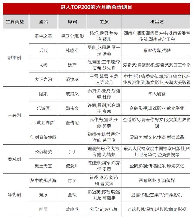 都市剧《重中之重》《后浪》《大考》《大运之河》本月杀青的项目中,献礼题材占比颇多,商业性强的项目较少。《后浪》是唯一一例。由耀客传媒、优酷出品,六六编剧,《后浪》虽相对商业化,但也少不了对正能量的渲染。一方面,该剧是少数由老戏骨领衔主演的都市题材作品,在厚重感上更强;另一方面,该剧的题材以中医传承为主线,自带传统文化价值。而在商业化的部分,赵露思、罗一舟等年轻演员有一定的流量属性,老师+学生群的设定在都市题材里还颇具新鲜感。