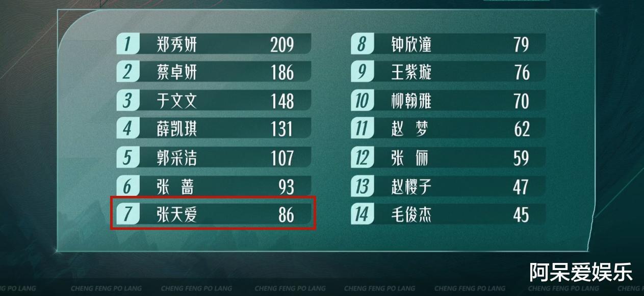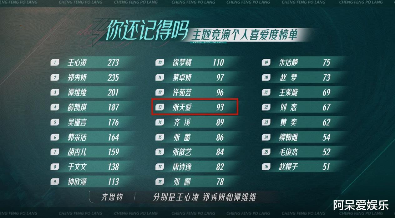 第二次舞台公演张天爱获得93票,全场排名第13。