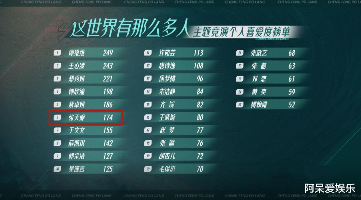 第三次舞台公演张天爱获得174票,全场排名第6。